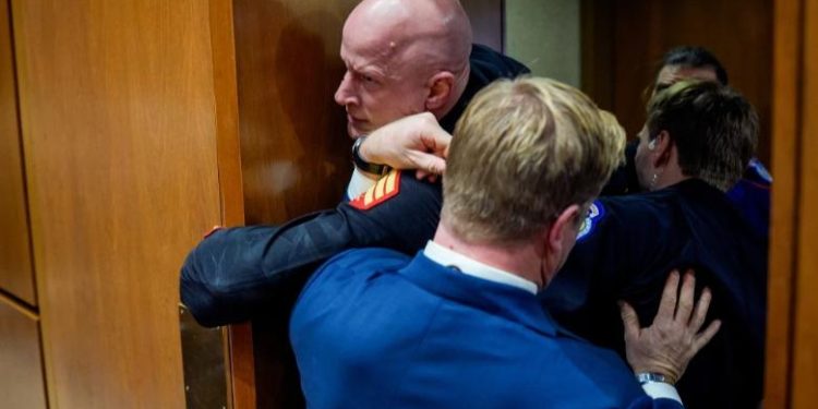 “Asnjë nuk dëshiron të luftojë për Izraelin”, tha ai dhe ndërsa përpiqeshin ta nxirrnin jashtë, kishte futur dorën në hapësirën e kornizës së derës. Senatori iu bashkua rojeve të sigurisë, të cilët s’po arrinin dot ta mbanin marinsin që tha se Sheehy i theu dorën.