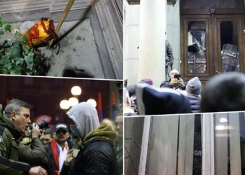 Një grup protestuesish u përpoqën të hynin me forcë në bashkinë e Beogradit këtë mbrëmje duke thyer xhamin e derës...