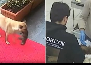 Një qen endacak, nën një shi të vazhdueshëm, ka dërguar këslyshin e saj të sëmurë para derës së një klinike...