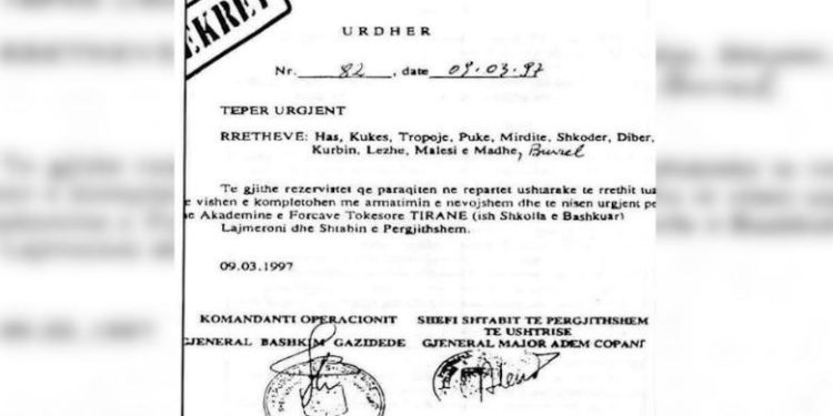 Ish-deputeti socialist Petro Koçi ka publikuar një urdhër sekret të lëshuar në vitin ’97 nga Shefi i Shtabit të Përgjithshëm të Ushtrisë, Gjeneral Major Adem Copani dhe Gjenerali Bashkim Gazidede.