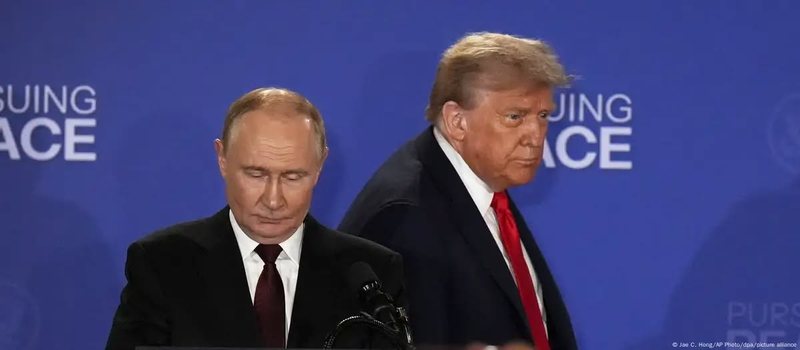 Rreth tre orë pas fillimit të bisedimeve të tyre me dyer të mbyllura, Trumpi dhe Putin u shfaqën secili pas një podiumi, pranë flamurit amerikan dhe atij rus. Midis tyre qëndronte motoja «Pursuing peace» («Duke ndjekur paqen») – por për paqe nuk mund të bëhej fjalë.