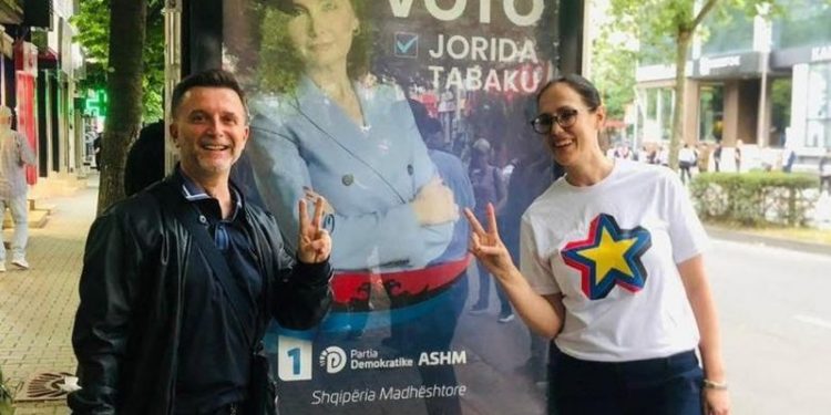 Erion Braçe dhe Delina Ibrahimaj pozojnë me dy gishtat lartë para posterit elektoral të Jorida Tabakut