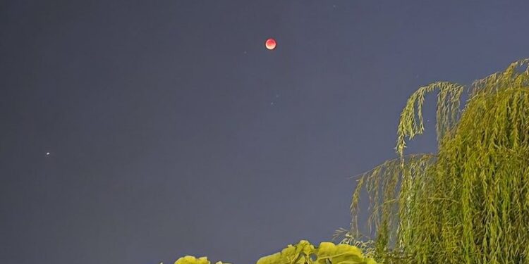 Hëna, e mbuluar nga hija e Tokës, ka marrë një ngjyrë të kuqërremtë, duke krijuar të ashtuquajturën “hënë e përgjakur”.