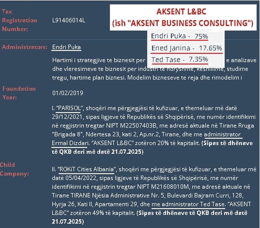 AKSENT L&BC (1 shkurt 2019) Puka 75%, Ened Janina dhe Ted Tase 25% së bashku. Qarkullim i raportuar 17 mln € jashtë sistemit bankar/tatimor.