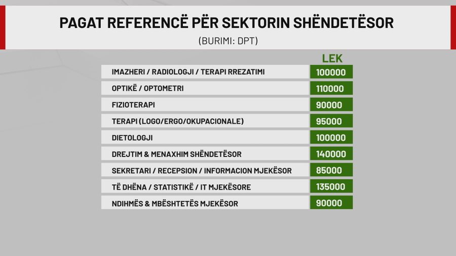 Në mjekësi, pagat dysheme variojnë nga 80 mijë lekë për profilet mbështetëse deri në 215 mijë lekë për profesionet më të specializuara si kirurgjitë e avancuara dhe anesteziologjia. Specialitete si kardiologjia, neurologjia apo gastroenterologjia vendosen rreth 200 mijë lekë, ndërsa një mjek i përgjithshëm llogaritet me 163 mijë lekë.