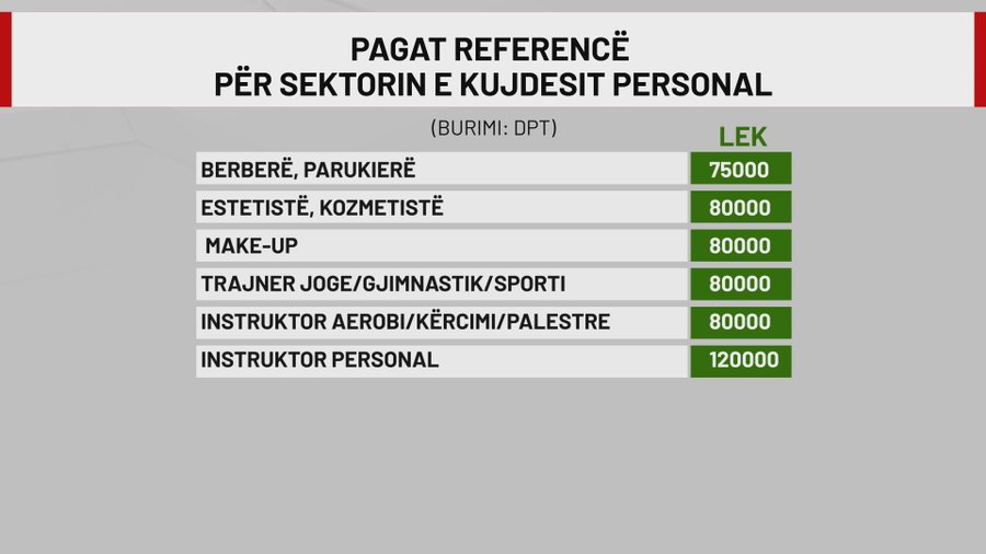 Për estetistët, kozmetistët dhe “make-up artist” paga referuese është 80 mijë lekë. Po aq për instruktorët në aerobi apo kërcim. Për instruktorët personalë në palestër është caktuar paga 120 mijë lekë në muaj.