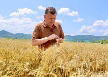 Më një pozim mes një fushe me grurë, tipike që të kujton imazhet idilike të propagandës së dikurshme socialiste, kreu...