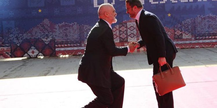 Kryeministri i Luksemburgut, Xavier Bettel ka bërë Edi Ramën që t’i ulet në gjunjë. Në momentin që Bettel u afruan me çantën e tij në dorë, Rama u ul në gjunjë për arsye që dihen.