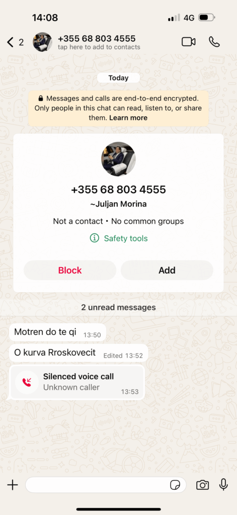 Pas publikimit të shkrimit investigativ mbi biznesmenin Lul Morina, ku u faktua e kaluara e tij kriminale si trafikant femrash dhe droge, lidhjet e tij me pushtetin e sotëm dhe përfitimi i lejeve të ndërtimit falë mbështetjes politike nga Belinda Balluku, unë jam kërcënuar hapur. Morina më ka dërguar mesazhe fyese ndaj familjes sime dhe ka përdorur gjuhën e shantazhit për të më frikësuar.