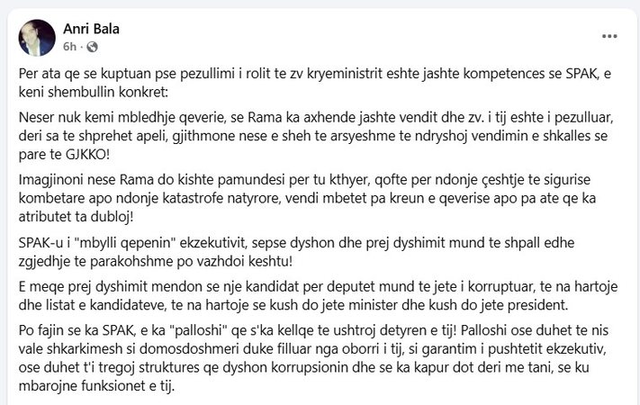 Reagimi i Anri Balës në Facebook: