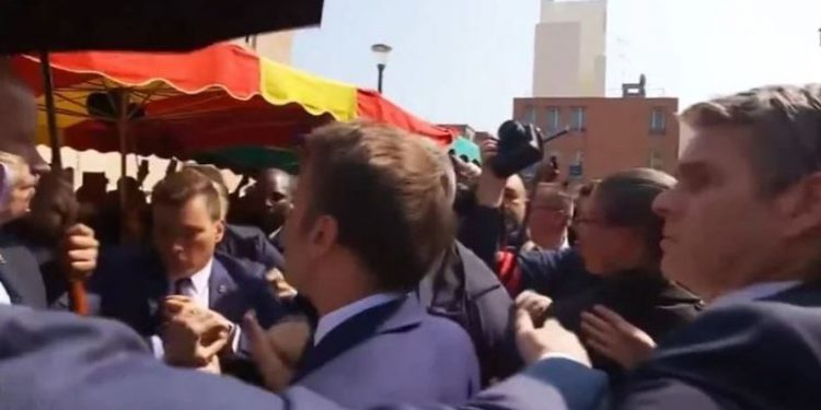 Kjo ishte dalja e parë publike e tij që nga raundi i dytë i zgjedhjeve të dielën, më 24 prill. Sapo një person nisi të hedhë perimet në drejtim të Macron, i menjëhershëm ka qenë reagimi i truprojave të tij, siç duket edhe nga videot që janë hedhur në rrjetet sociale dhe mediat franceze.