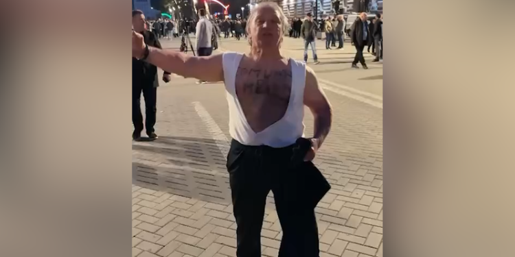 Por, ndërsa pjesëmarrësit rrallohen nga protesta në protestë dikush duket se e ka marrë seriozisht thirrjen e tij. Në një video nga momentet e para të grumbullimit, shihet teksa kalon pas gazetares një burrë me këmishë të shqyer, i çorientuar, i shkëputur nga çdo logjikë e organizuar e protestës. Ai nuk duket as pjesë e koreografisë, as i përfshirë në mesazhin politik.