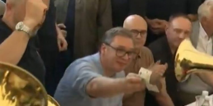 Të ftuarit shijuan një vakt të pasur dhe muzikën me trombistë, ndërsa në pamjet e publikuara në rrjetet sociale shihet Vuçiç duke u relaksuar me një gotë birrë.