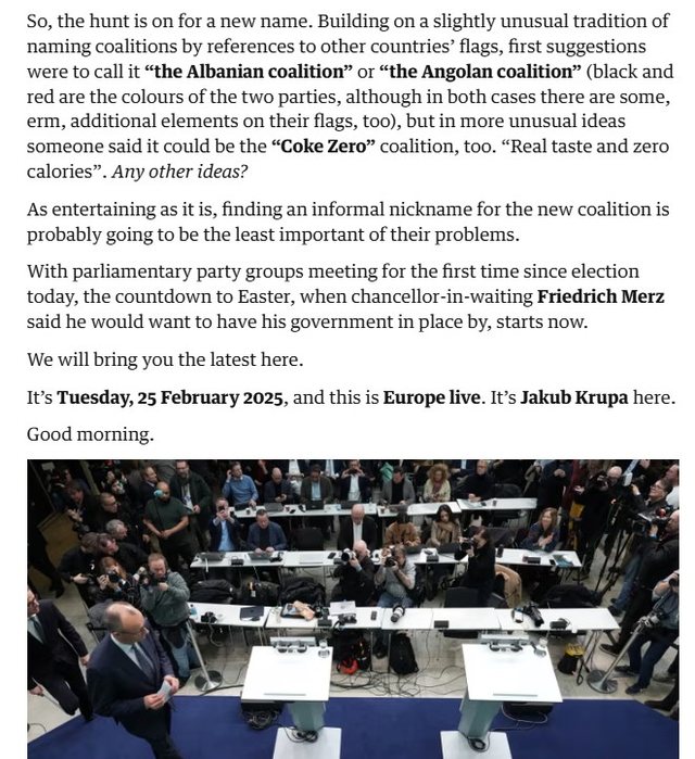“The Guardian” duke iu referuar një lajmi në agjencinë gjermane shkruan se tani dilema është për emrin e ri të koalicionit që do ta udhëheqë Gjermaninë. Duke u bazuar në ngjyrat e dy partive (kuq e zi), mediumi prestigjioz në një artikull të martën, ka thënë se si ide janë përmendur emri “koalicioni shqiptar” apo edhe ai “i Angolës”. Por disa kanë propozuar edhe një emër më të çuditshëm: “Koalicioni Coke Zero” – “Shije e vërtetë dhe zero kalori.